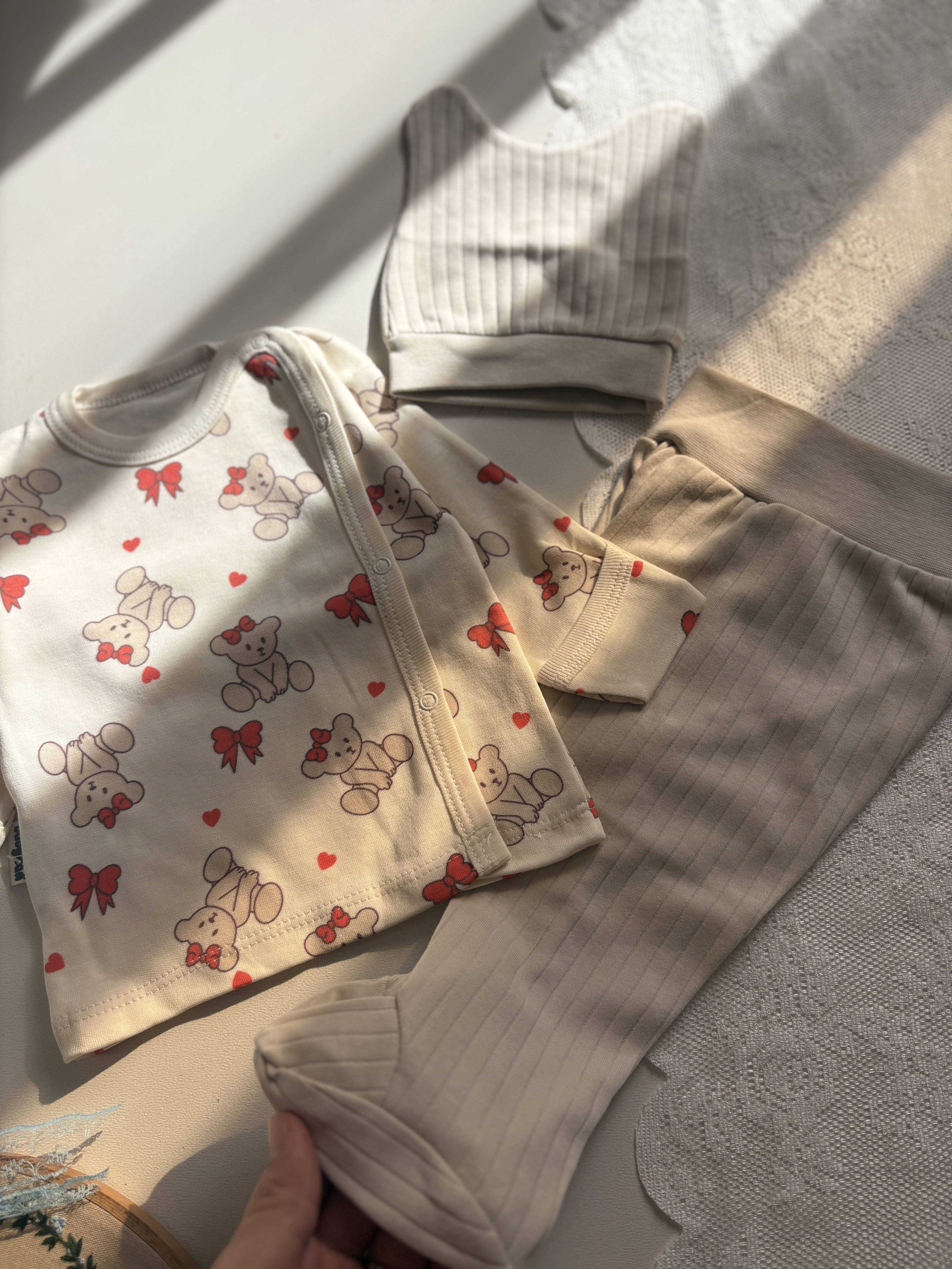 ست های سه تیکه پرطرفدار ترک 🇹🇷 درواقعا این ست ها کاراییه یه ست پنج تکه رودارن چون هم آستینشون حالت دستکش میشه وهم شلوارشون جورابداره .. کیفیت بی نظیر صددرصد پنبه ،مناسب پوست حساس نوزاد سایر ۰ تا۳ ماه